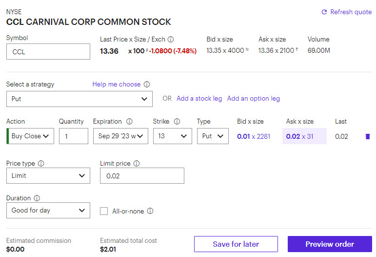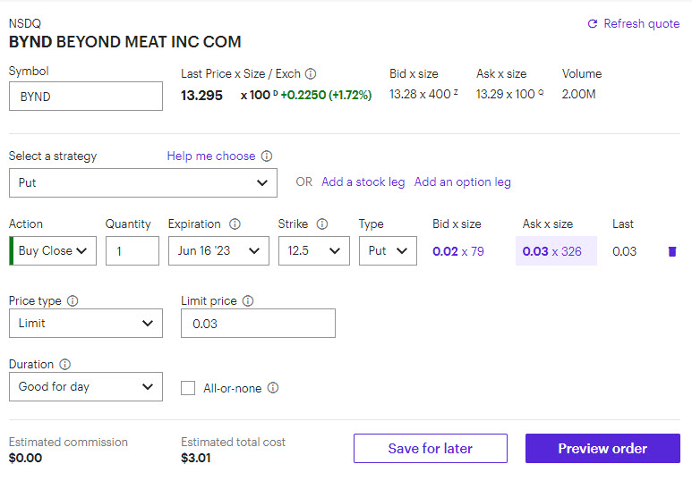 BYND is now trading for about 3 cents, so let’s close it here and take our profits. See screenshot details below for how to close – just remember you are buying to close the 12.5 put. We sold the 12.5 puts for around 26 cents, so if we close at 3 cents, we’re collecting 23 cents or 1.8% profits in under 2 days.