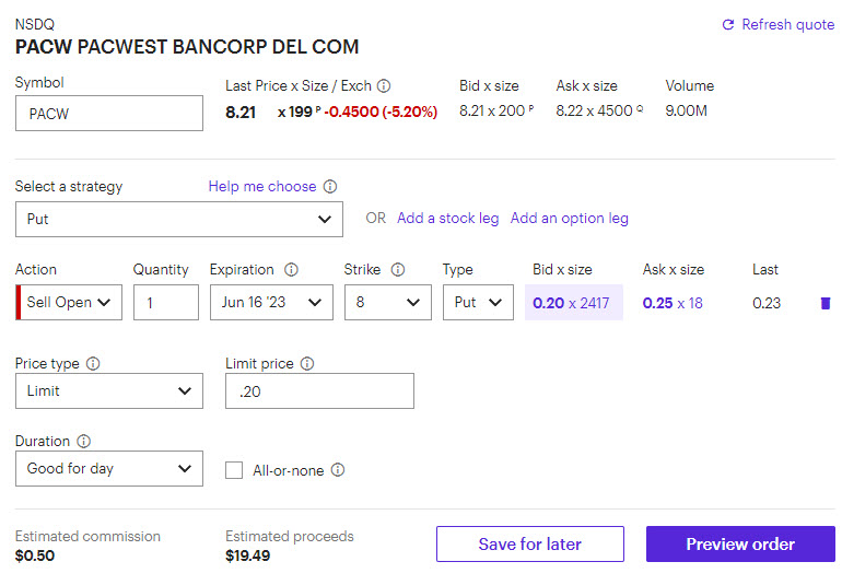 The second trade is PACW and this one is a bit closer to the money. I’m going to show a screenshot of selling the June 16th 8 puts for around 20 cents, but it’s also a reasonable trade to sell the 7.5 puts for around 10 cents. If you sell the 8 puts, that’s a return on cash of 2.4%. You can close them when the price gets to be under 5 cents. For the 7.5 puts, (1.2% return on cash) you’ll most likely want to let them expire.