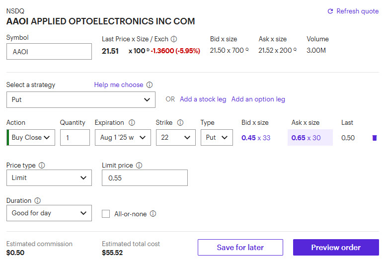 For AAOI, we can buy back (buy to close) the 22 put for around 55 cents. We’ll take a small loss on the trade.
