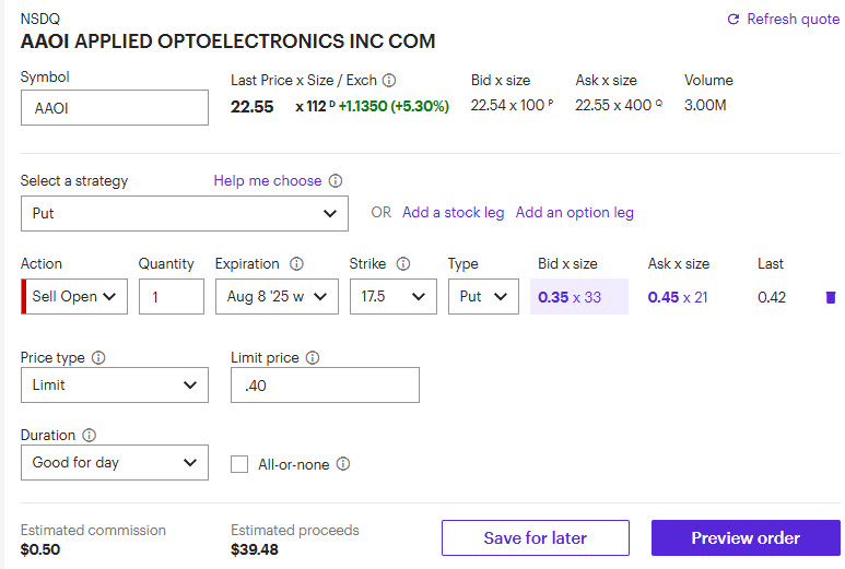 In the live session today, we sold the AAOI August 8th 17.5 put for around 40 cents. Earnings are tomorrow. You’ll need 1,750 per put sold in a cash account to make the trade. I’ll send out closing info on Friday.