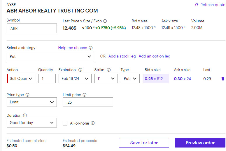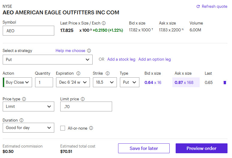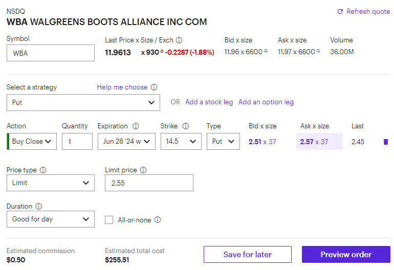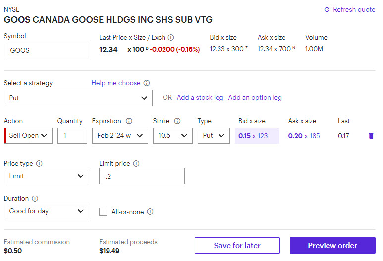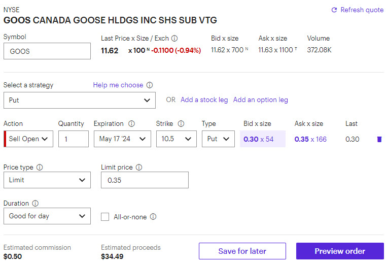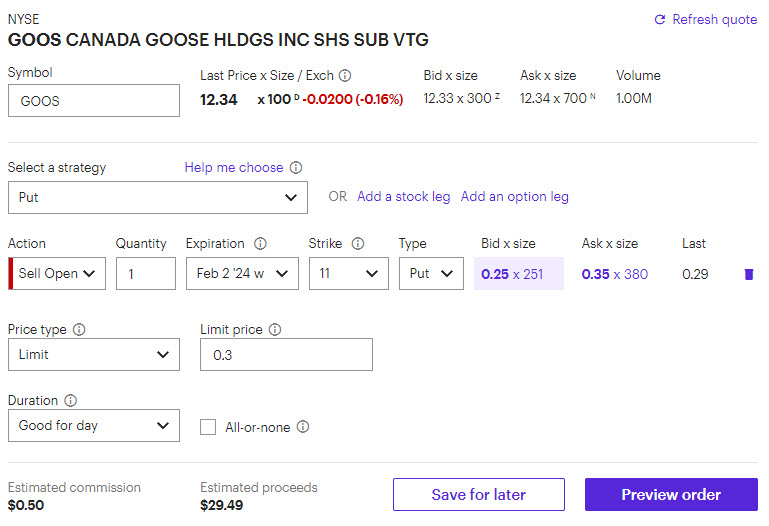For GOOS we can buy back (buy to close) the 11.5 put for around 25 cents. We’ll take a very small loss on the trade (almost breaking even).