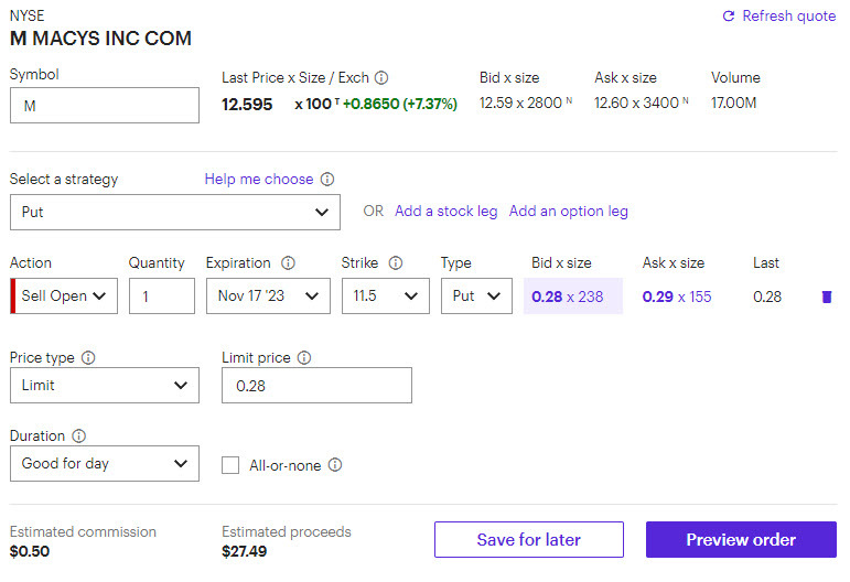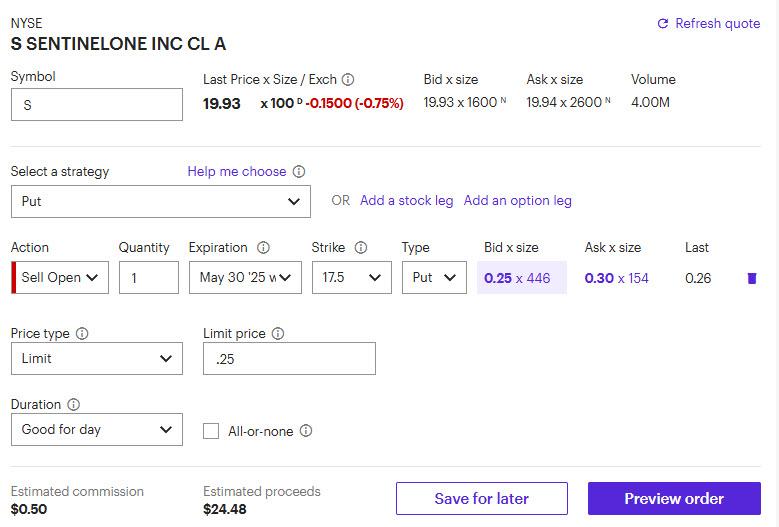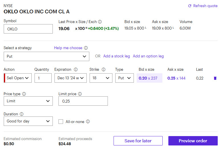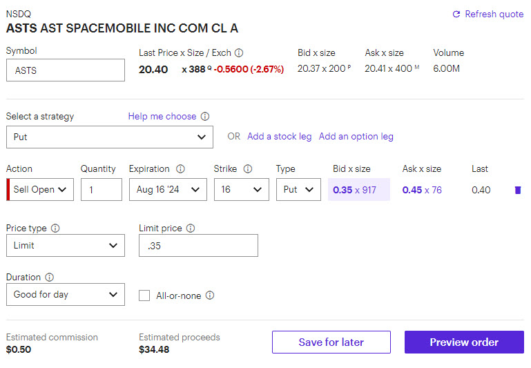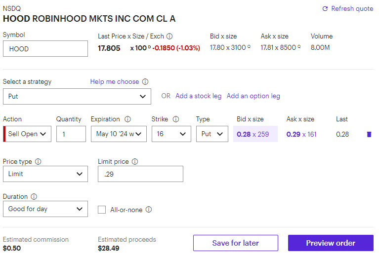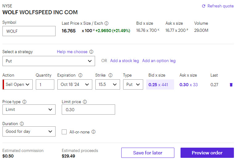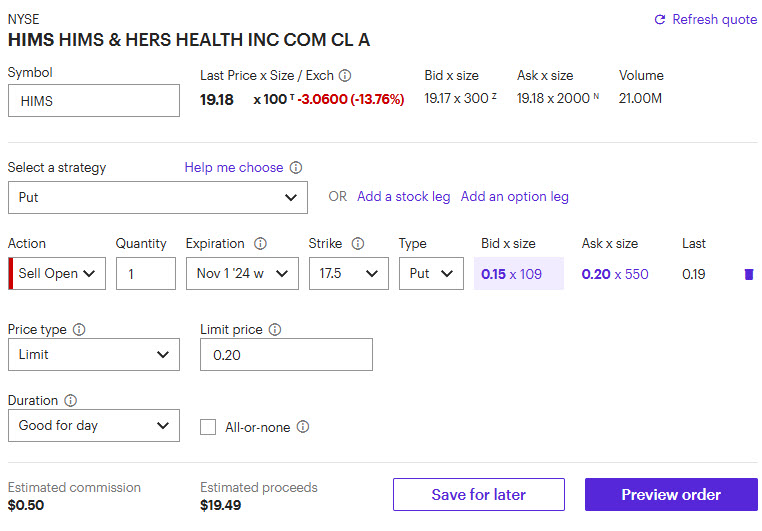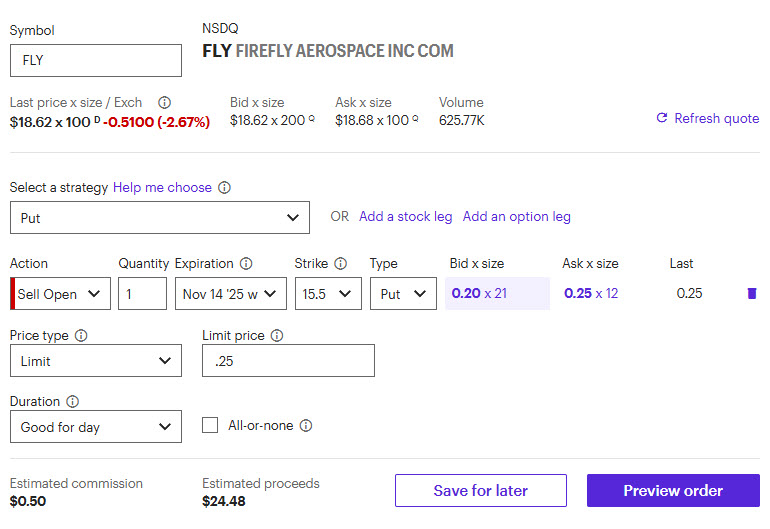 In the live session today we sold the FLY November 14th 15.5 put in the 25-30 cent range. You’ll need 1,550 per put sold in a cash account to make the trade. Earnings are after close today. I’ll send out closing info on Friday.