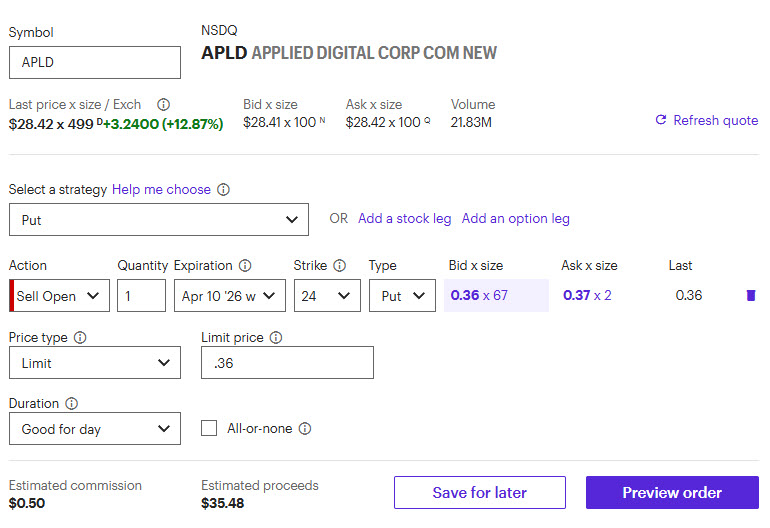 In the live session today we sold to open the APLD April 10th 24 put for around 36 cents. Earnings are tonight after close. You’ll need 2,400 per put sold in a cash account to make the trade. I’ll send out closing info on Friday.