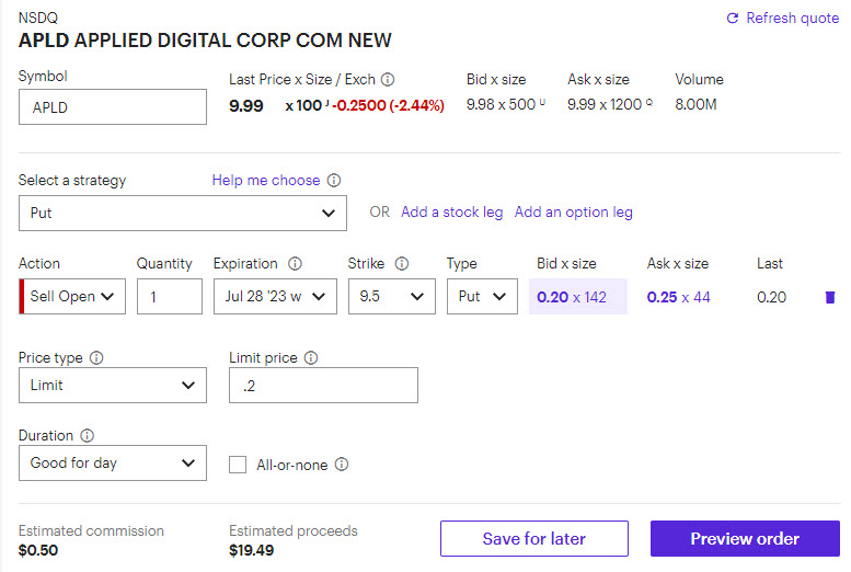 We have two trades today, APLD and ENVX. In ENVX, we’re selling the 16 strike for around 25 cents and it’s about 18% away from the stock price. The company does have earnings tonight, so it’s likely to gap one direction or the other. On the other hand, APLD doesn’t have earnings and selling the 9.5 put for around 20 cents produces a higher potential return than ENVX. However, the stock is around 10, so the put is much closer to the money.