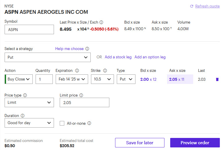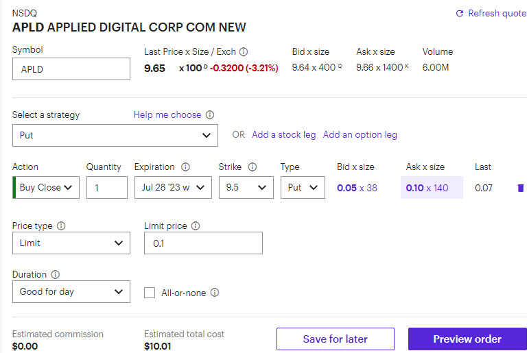 Okay, so we can let ENVX expire for zero which means we’ll earn 1.6% on that trade (about 25 cents). For APLD, we’ll close here to be safe. We’ll place a buy to close limit order for 10 cents (as seen below), but you should get filled for about 7 cents. If so, we’ll make about 13 cents on the trade or a return of 1.4%.