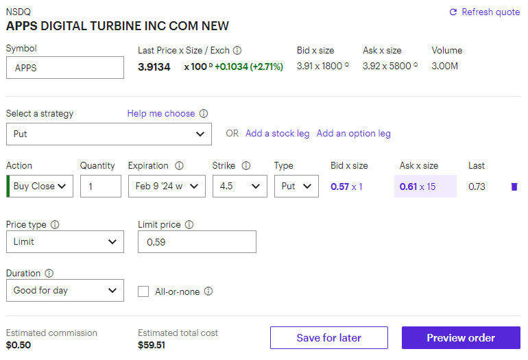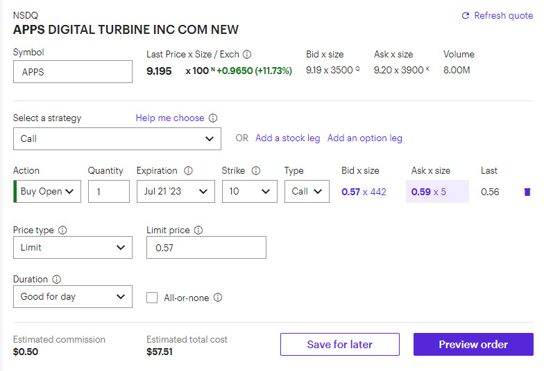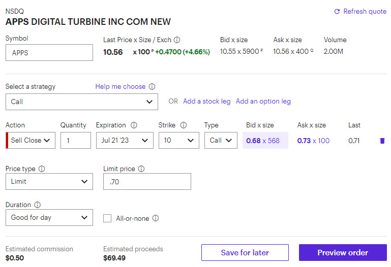 Okay, you now should be out of the put trade by either holding the shares or holding cash. If you want to keep the shares to give them time to recover, that’s a perfectly reasonable alternative. APPS is oversold at this point and it will recover in time. (For more experienced traders, you can even sell calls against those shares and turn them into covered calls.) For everyone else, if you don’t want to have your capital tied up in the stock, we’re going to buy a call instead. This will allow us to take part in the recovery without tying up the capital.