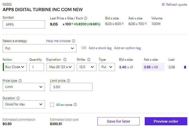 We’re selling (to open) the APPS May 26th 12.50 puts for around 33 cents. I’ll send out a closing text tomorrow or Friday but you can use 5 cents as an approximate closing level. Earnings are after close today, so the stock may move quite a bit when it opens tomorrows.