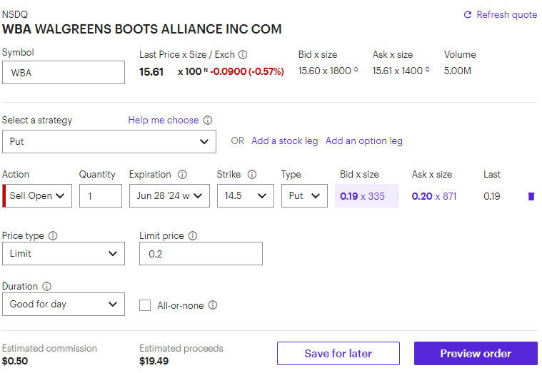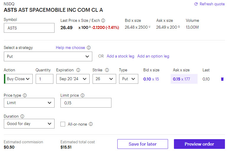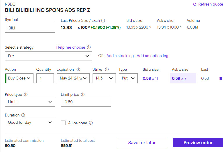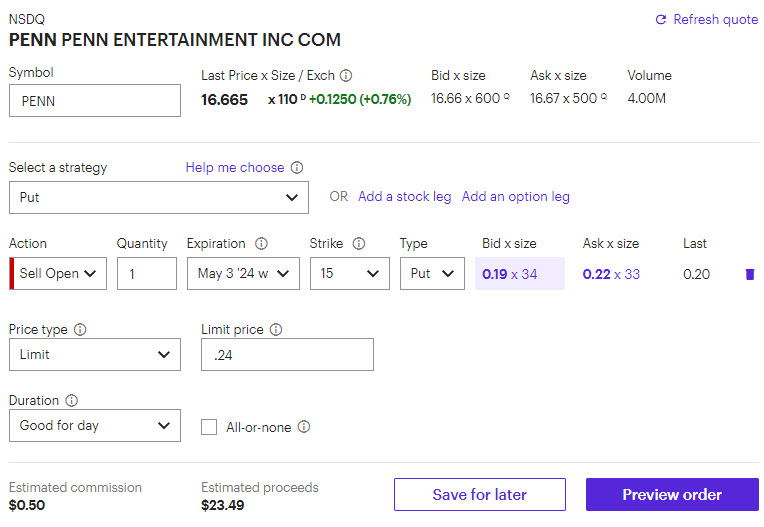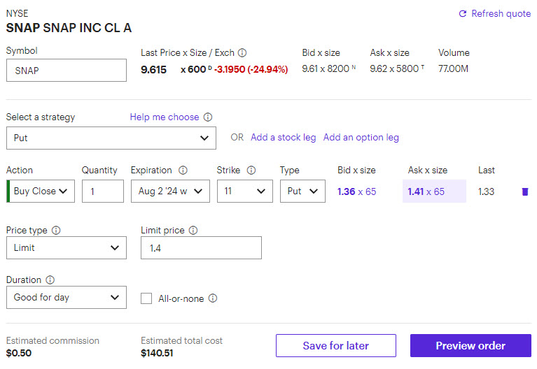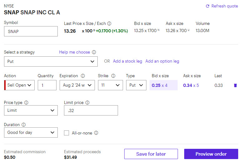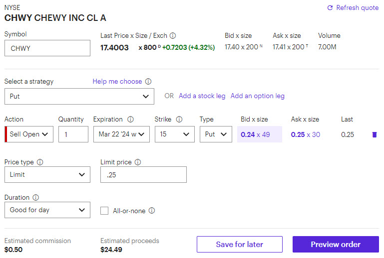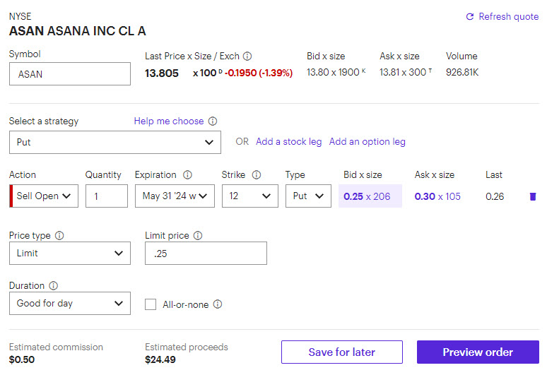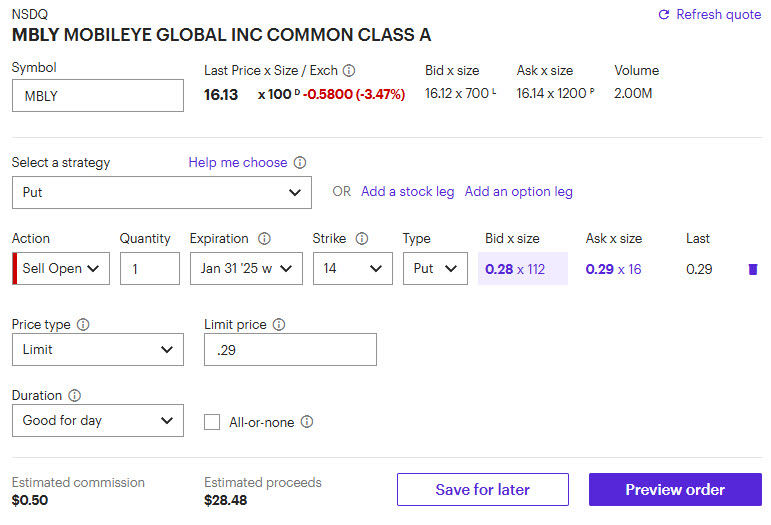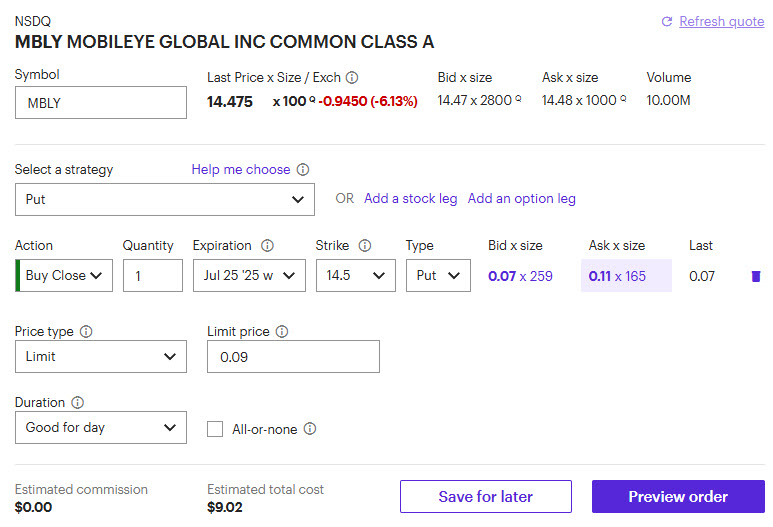 MBLY is sitting right around 14.50 strike. We can still close for a profit though, so let’s do that now instead of taking a chance on getting assigned on the shares. To close, simply buy to close the 14.50 put for around 9 cents.