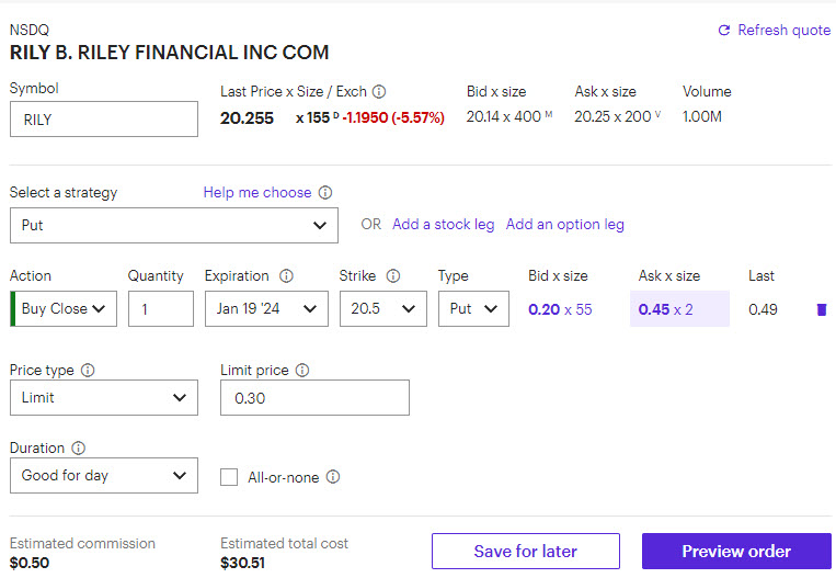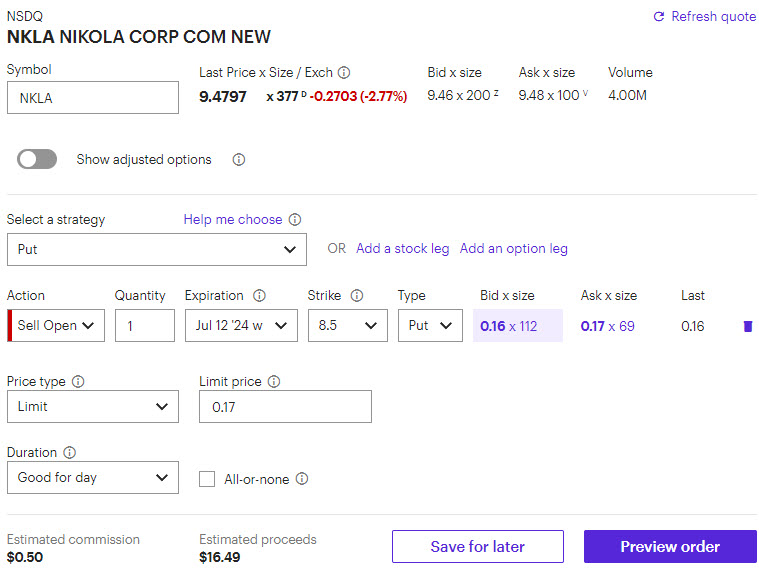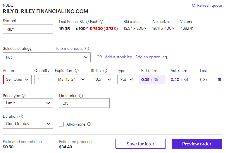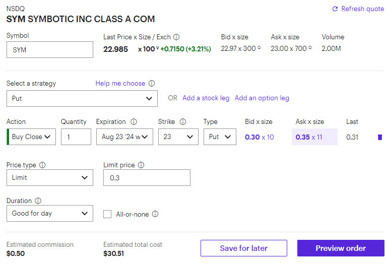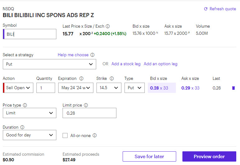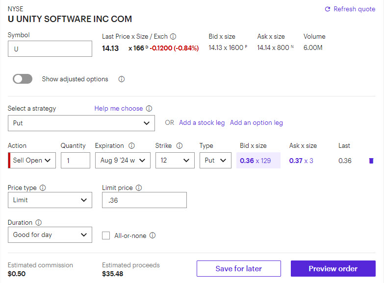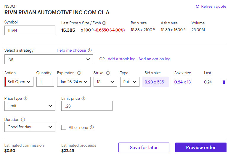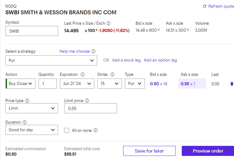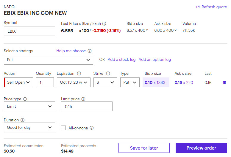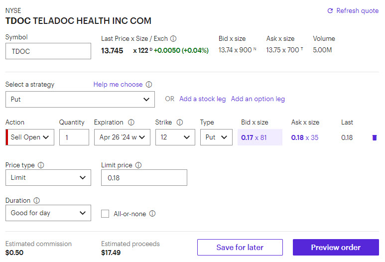 MBLY is sitting right around 14.50 strike. We can still close for a profit though, so let’s do that now instead of taking a chance on getting assigned on the shares. To close, simply buy to close the 14.50 put for around 9 cents.