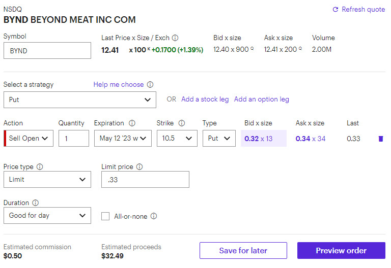 Here’s our first 48-Hour Income trade! We’re selling to open the BYND May 12th 10.50 put for around 33 cents. Trade details are below. I’ll also send out a closing alert tomorrow or Thursday or a note letting you know to let the trade expire.