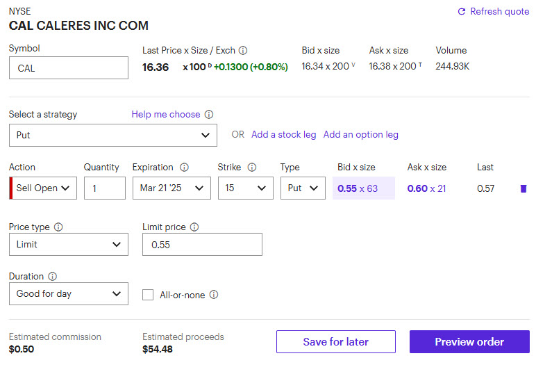 Today our 2-day cash secured put trade is in JWN. We’re selling the 15.50 put for around 27 to 29 cents. The put price has dropped a bit, so you may need to leave your offer in there for a little while before it gets filled. Details can be found below.