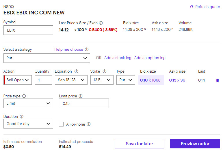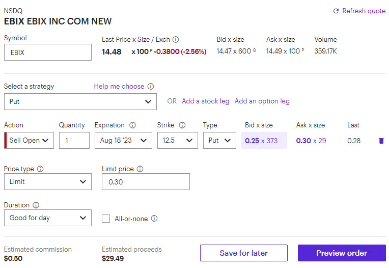 Today our 2-day cash secured put trade is in EBIX. We’re selling the 12.50 put for around 30 cents. The put price has dropped a bit, so you may need to leave your 30 cent offer in there for a little while before it gets filled. Details can be found below.