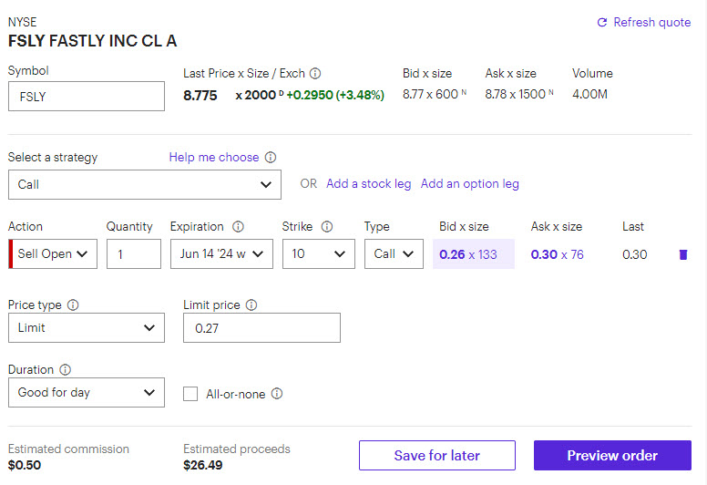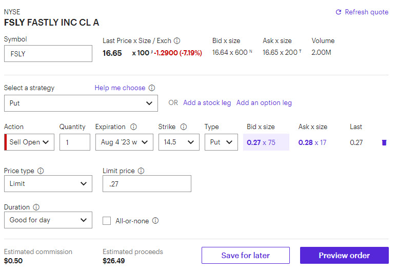 We have two trades today, FSLY and TRIP. In FSLY, we’re selling the 14.50 strike for around 27-30 cents. In TRIP, we’re selling the 16 strike for around 30-35 cents. Details can be found below.