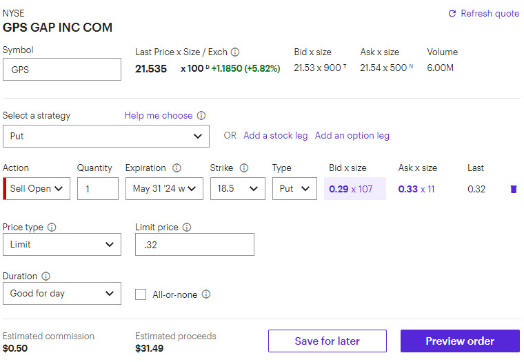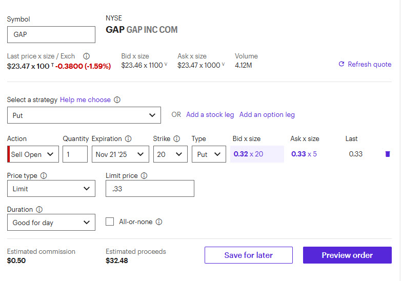 In the live session today, we sold the GAP November 21st 20 puts for around 33 cents. Earnings are tomorrow. You’ll need 2,000 per put sold in a cash account to make the trade. Closing info will be sent on Friday.