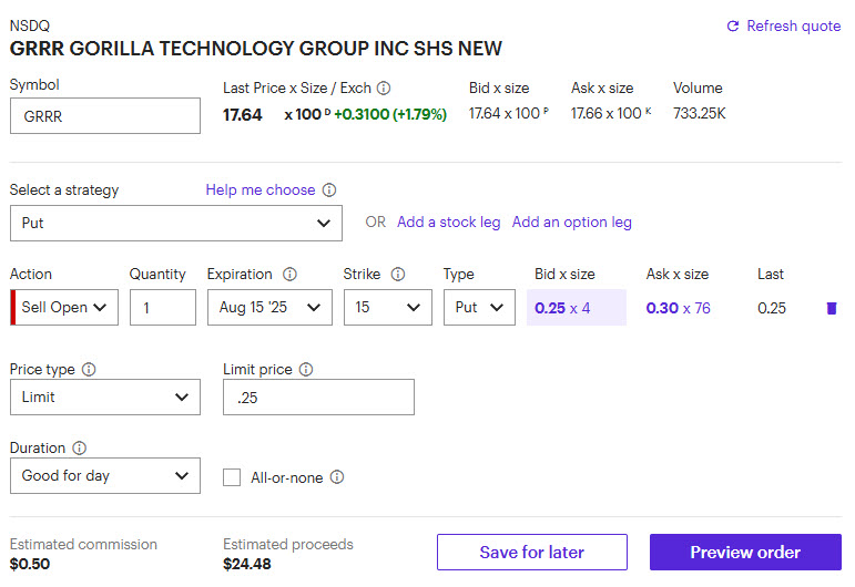 In the live session today, we sold to open the GRRR August 22nd 16.50 put for around 25-30 cents. You’ll need 1,650 in a cash account per put to make the trade. I’ll send out closing info on Friday.