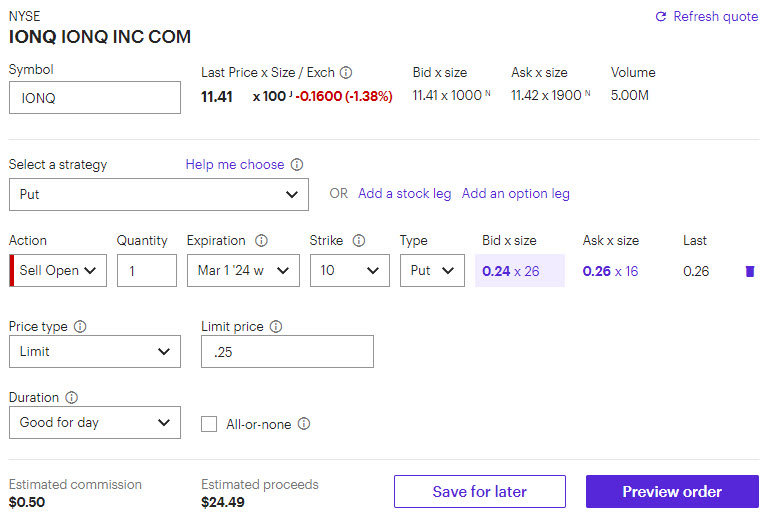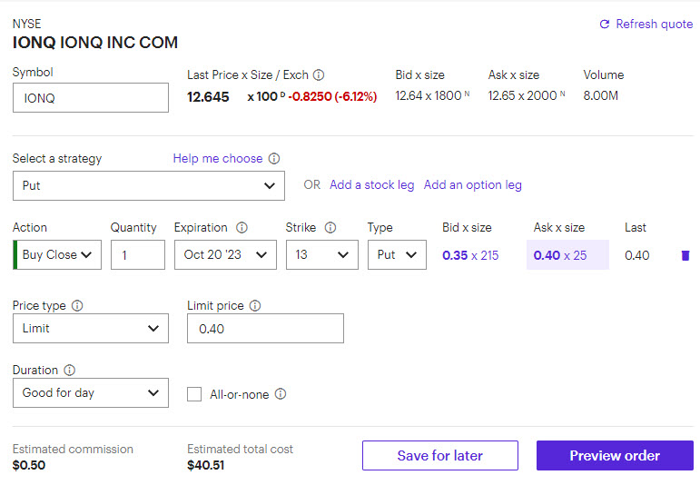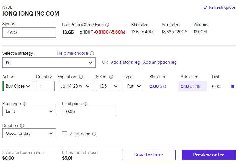 We’re a bit too close for comfort here, so let’s close our IONQ puts for 5 cents. It’s a buy to close order as seen below in the screenshot. Assuming a sell price of 20 cents and closing price of 5 cents, our return is 1.1% in about 2 days.