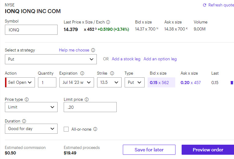 Okay, the new trade is in IONQ. It has moved a bunch since we started, so I’d only make this trade if you can 20 cents for the 13.5 puts. If not, skip the trade. We’ll have lots of opportunities for better trades during earnings season. Patience, as always, is a good thing. My intention is to hold this trade to expiration as long as the stock remains above the strike price, but I’ll send out a closing/commentary text regardless.