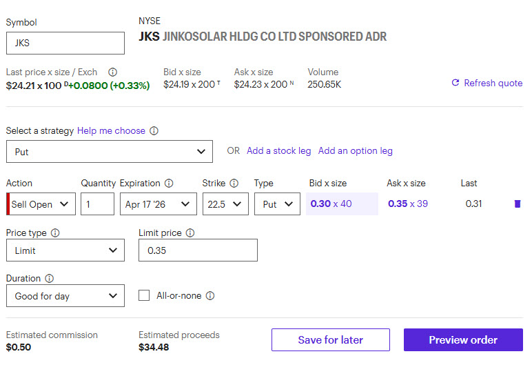 In the live session today we sold the JKS April 17th 22.5 puts for around 35 cents. Earnings are tomorrow after close. You’ll need 2,250 per put sold in a cash account to make the trade. I’ll send out closing info on Friday.