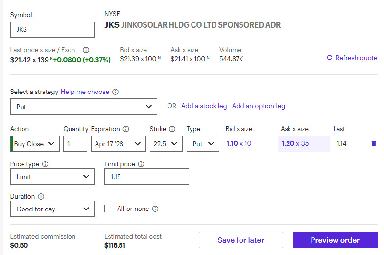 JKS got hit harder than expected on earnings yesterday. We got a small rebound this morning, but not enough to get us back into a profitable position. Moreover, the share price has already come back to down to nearly unchanged. There’s nothing to do on this trade but buy back the put for a loss. Make sure when buying the put back, you are buying to close (as seen in the screenshot below).