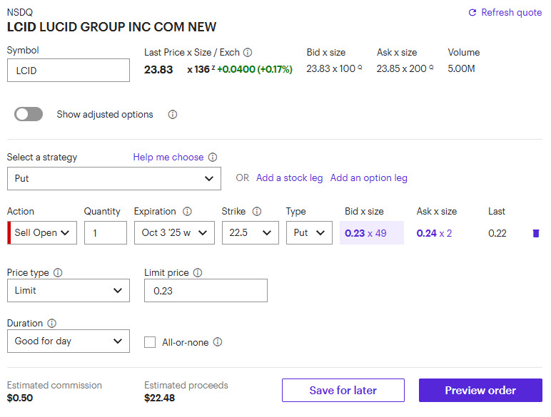 For this week, we are selling to open the LCID October 3rd 22.5 put for around 23-25 cents. You’ll need 2,250 per put sold in a cash account to make the trade. I’ll send out closing info on Friday.