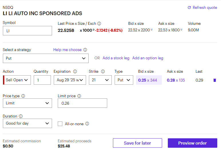 In the live session today we sold to open the LI August 29th 21 put for around 26-27 cents. Earnings are tomorrow. You’ll need 2,100 per put sold in a cash account to make the trade. I’ll send out closing info on Friday.