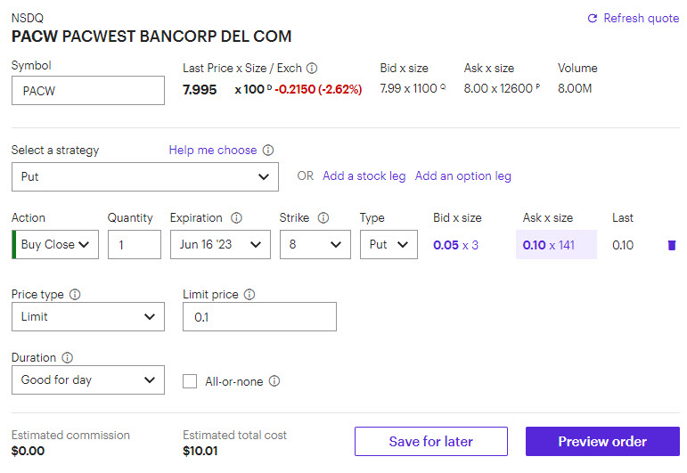 We don’t want to be assigned on PACW shares, so let’s close our trade. You’ll have to enter the buy to close limit order in at either 5 or 10 cents, but if you use 10 cents, you’ll likely get filled at a price lower than 10 cents (the last trade I saw was filled at 7 cents). We collected 15-20 cents for the 8 puts and if we close them here, we should get filled for around 7 cents. Let’s say we opened at 15 and closed at 7, that’s 8 cents collected, or 1% in profit in less than 2 days. See trade details below.