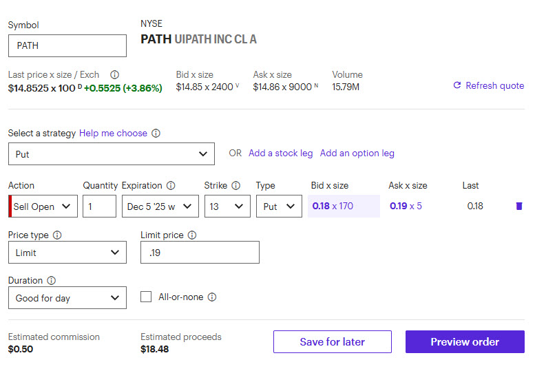 In the live session today, we sold the PATH December 5th 13 put for around 19-20 cents. Earnings are today after close. You’ll need 1,300 per put sold in a cash account to make the trade. I’ll send out closing info on Friday.