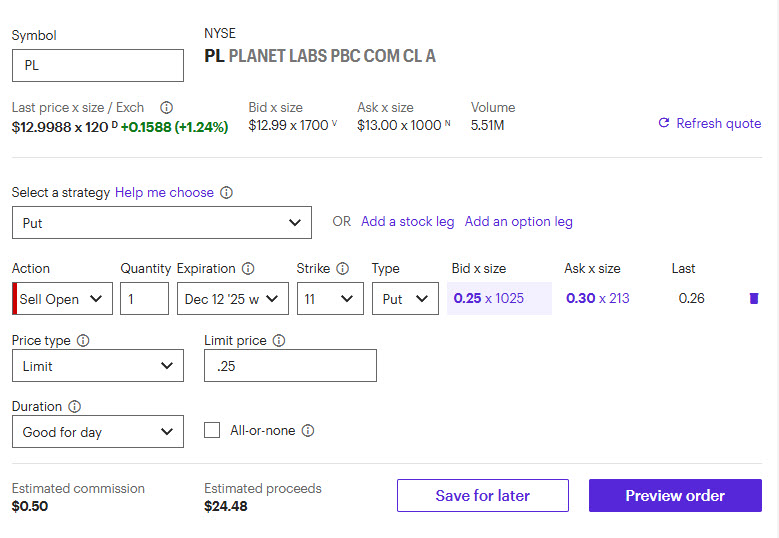 In the live session today we sold the PL December 12th 11 put for around 25 cents. Earnings are after close today. You’ll need 1,100 per put sold in a cash account to make the trade. I’ll send out closing info on Friday.