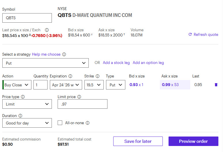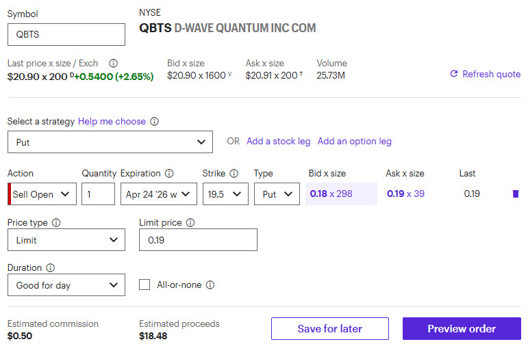In the live session today, we sold to open the QBTS April 24th 19.5 put for 19-20 cents. You’ll need 1,950 per put in a cash account to make the trade. I’ll send out closing info on Friday.