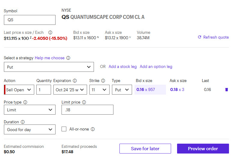 In the live session today, we sold the QS October 24th 11 puts for around 18-19 cents. Earnings are today after close. You’ll need 1,100 per put sold in a cash account to make the trade. I’ll send out closing info on Friday.