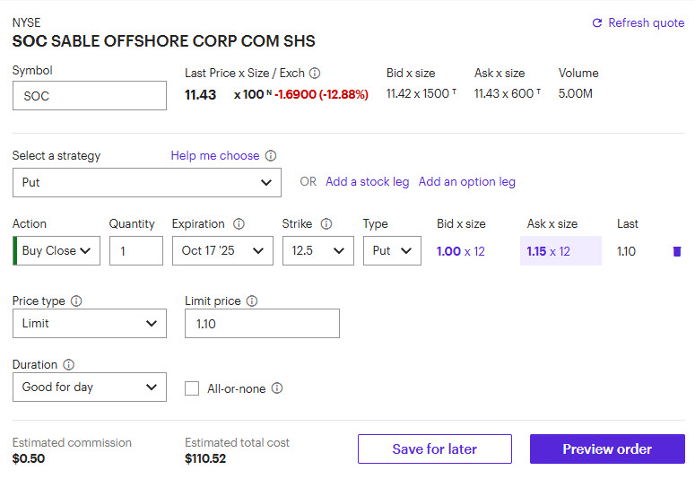 In the live session today, we sold the SOC October 17th 12.5 put for around 20-25 cents. You’ll need 1,250 per put sold in a cash account to make the trade. I’ll send out closing info on Friday.