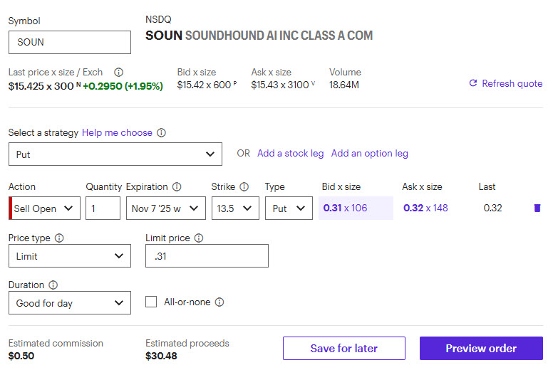 In the live session today we sold the SOUN November 7th 13.5 puts for around 31 cents. Earnings are tomorrow after close. You’ll need 1,350 per put sold in a cash account to make the trade. I’ll send out closing info on Friday.