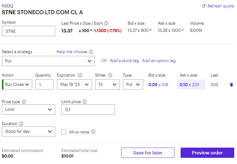 We’re selling (to open) the STNE May 19th 13 puts for around 30 cents. I’ll send out a closing text but if you haven’t been receiving texts you can use 10 cents as an approximate closing level. Earnings are after close today, so the stock may move quite a bit when it opens tomorrows.