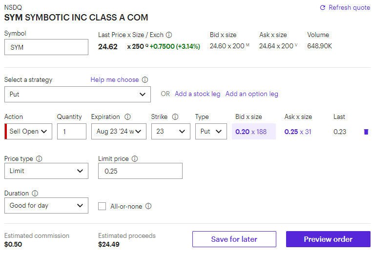 In the live session today, we sold to open the MBLY July 25th 14.5 puts for around 21 cents. You’ll need 1,450 per put sold in a cash account to make the trade. Earnings are tomorrow. I’ll send out closing info on Friday.