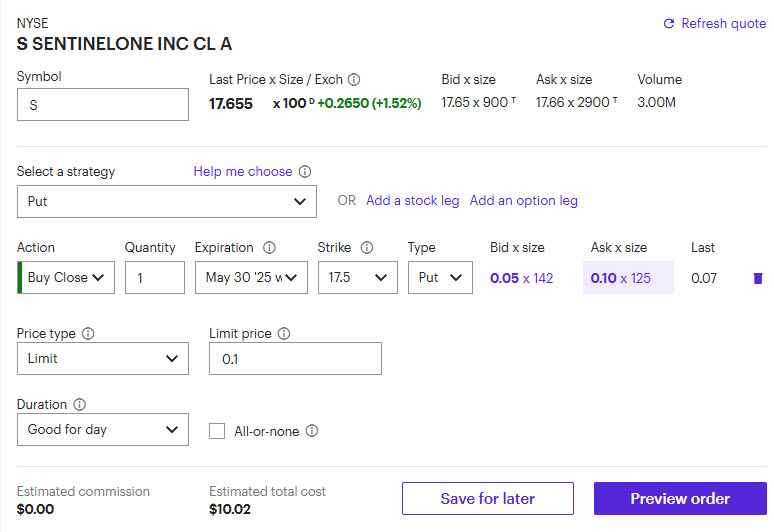 Okay, S is up to 17.65, and the 17.50 put is worth 5-10 cents right now. Let’s go ahead and close the trade out so we aren’t taking any chances of the market selling off into the close. If we buy to close at 10 cents, we are getting most of the premium and we may also get a fill price under 10 cents. Let’s go ahead and close the trade now. I posted the closed screenshot below. I’ll see you all in a couple weeks!