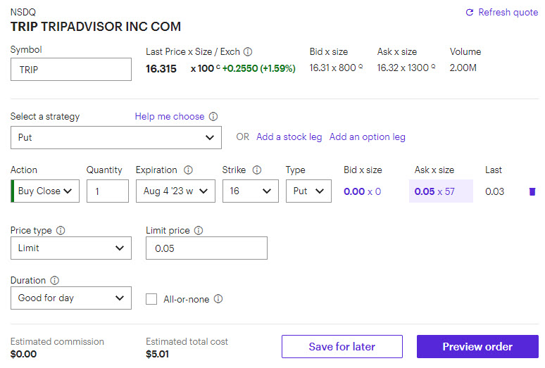 It’s been a relatively low stress week for our two trades. However, with the market selling off and TRIP getting a bit too close to our short strike, I think it makes sense to close the put in TRIP. For FSLY, we can just it expire for zero. We’ll buy to close the 16 put in TRIP for a limit of 5 cents (and you may get filled at a price lower than 5 cents). Details are below.