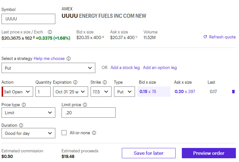 In the live session today, we sold the UUUU October 31st 17.5 puts for around 20 cents. You’ll need 1,750 per put sold in a cash account to make the trade. I’ll send out closing info on Friday.