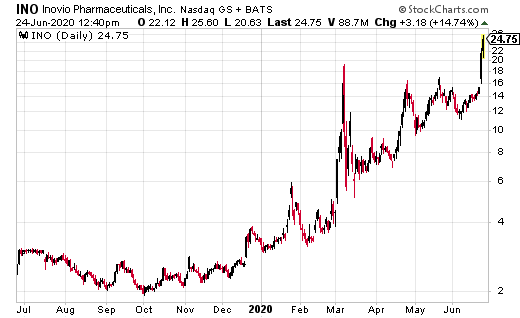 Shares of Inovio Pharmaceuticals (INO) jumped from $12.02 to $22.68 after receiving a $71 million contract from the US Department of Defense to scale up the manufacturing of CELLECTRA 3PSP smart device and the procurement of CELLECTRA 2000 devices, which are used to deliver INO-4800 directly into the skin.