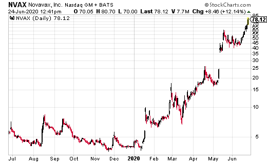 Novavax Inc. (NVAX) jumped from $45 to a high of $78.50 as the number of coronavirus cases explodes higher. The company was just awarded a contract by the U.S. Department of Defense (DoD) for the manufacturing of NVX‑CoV2373, Novavax’ COVID-19 vaccine candidate. NVX‑CoV2373 consists of a stable, prefusion protein antigen made using its proprietary nanoparticle technology and includes Novavax’ proprietary Matrix‑M adjuvant.