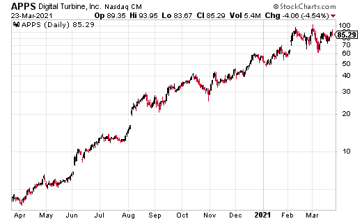 APPS, which provides media and mobile communication solutions for mobile operators, application developers, device original equipment manufacturers, has seen its stock run from a low of $10 to nearly $84 a share since November 2020.