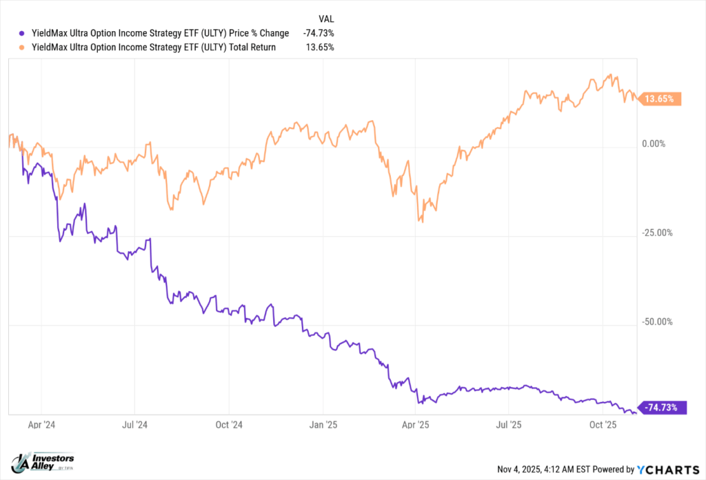 For the first year, ULTY struggled with significant NAV erosion. You can see from this chart how rapidly the share price declined, and the total return was a negative 4% at ULTY’s one-year birthday.