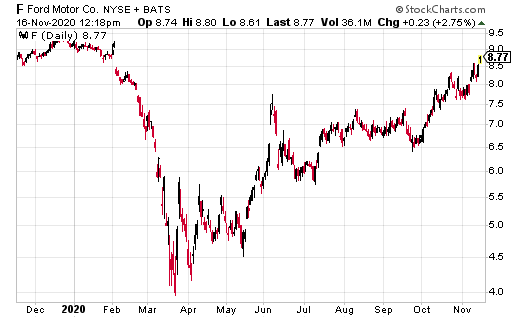The Ford (2021) F January 9 calls (F210115C00009000, $0.30, down $0.02) are currently trading for 30 cents. These options do not expire until January 16th, 2021 so the trade would have six to eight weeks to play out, depending on the technical setup.