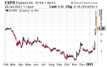 Express Inc. (EXPR) may be getting the same Reddit-style treatment. The stock ran from a low of $1.24 to a high of $7. In addition, a tweet surfaced that, “Express has been the subject of Reddit boards where users speculated whether it could be the next GameStop,” notes Business of Fashion. On Tuesday, EXPR volume was up to 58.8 million, as compared to daily average volume of 14.15 million shares.