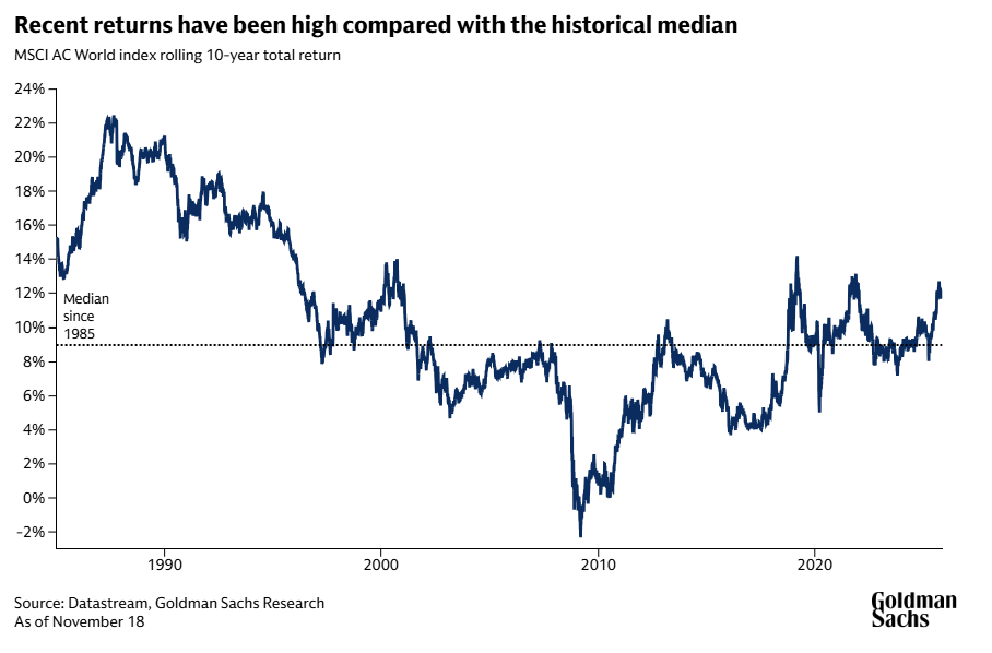 The Goldman forecast for global stocks is a 7.7% annual return over the upcoming decade. The report notes that the 7.7% forecast is below the 9.3% long-term average since 1985.