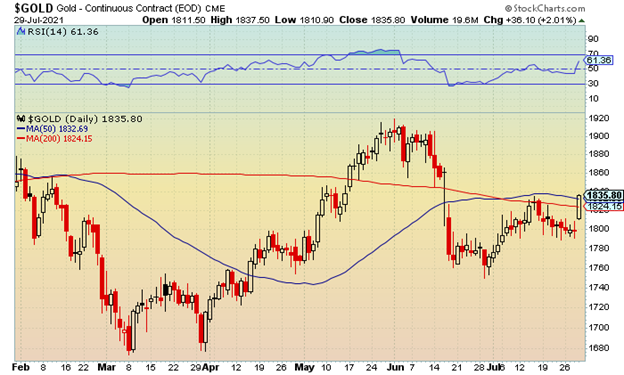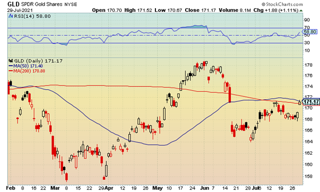 You can also trade options on GLD, with both making mini-breakouts last week towards their 50-day and 200-day moving averages. The chart shows a recovery from the mid-June plunge from $171 towards the $165 level following the recent gap higher.