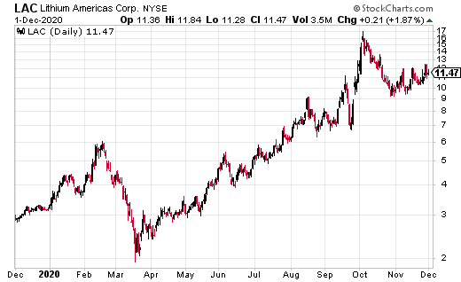 Thanks to an accelerating electric vehicle boom, lithium stocks – like Lithium Americas (LAC) are racing higher. In fact, since Sept. 2020, LAC ran from a low of $7 to $11.52, and could see higher highs on the lithium and electric vehicle (EV) stories.
