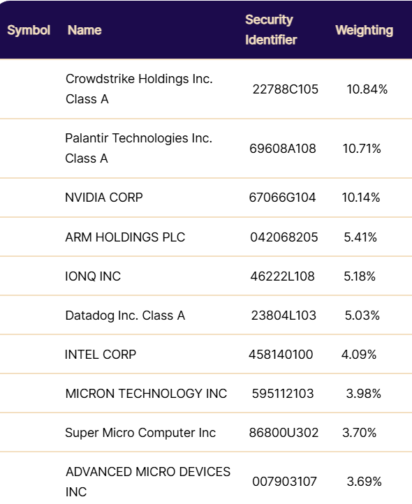 For an AI investment, I recommend the REX AI Equity Premium Income ETF (AIPI) to the subscribers of my high-yield ETF newsletter services. AIPI holds a portfolio of AI-related stocks. The fund employs a covered call option strategy to generate cash flow, which is used to pay monthly dividends. Here are the top AIPI holdings: