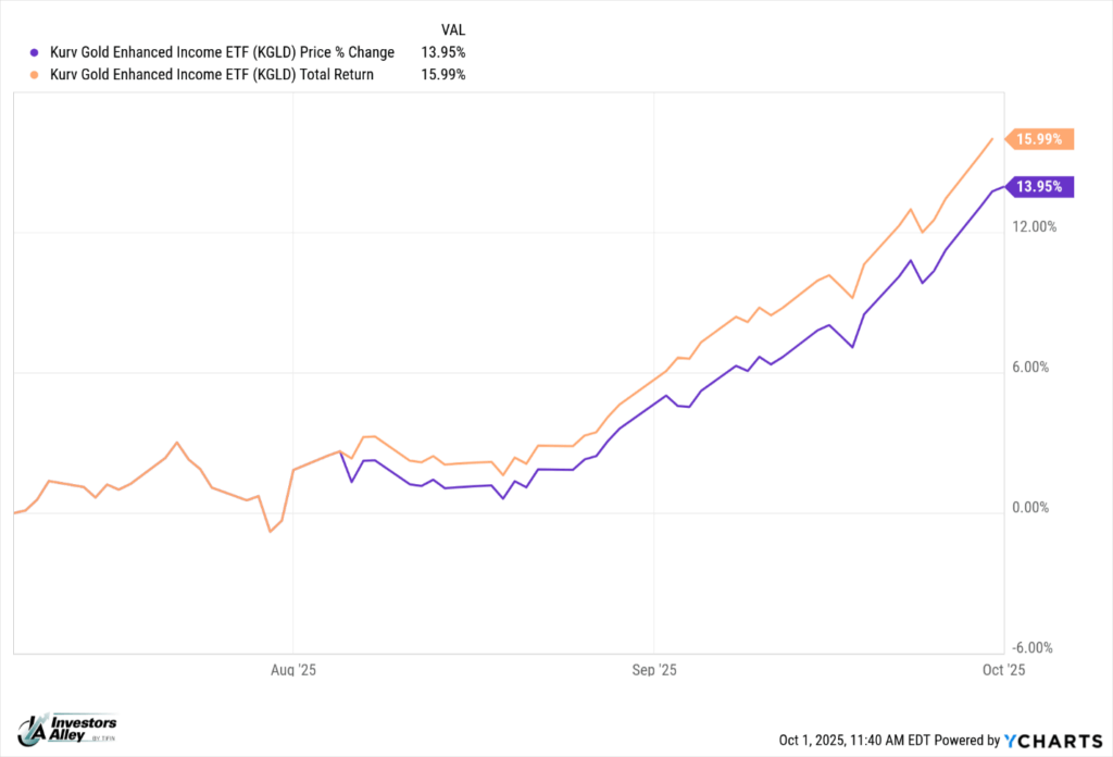 KSLV is a brand-new ETF, so we have no track record to review. However, the company had previously launched the Kurv Gold Enhanced Income ETF (KGLD) on July 8., which gives us about two and a half months of track record to examine.
