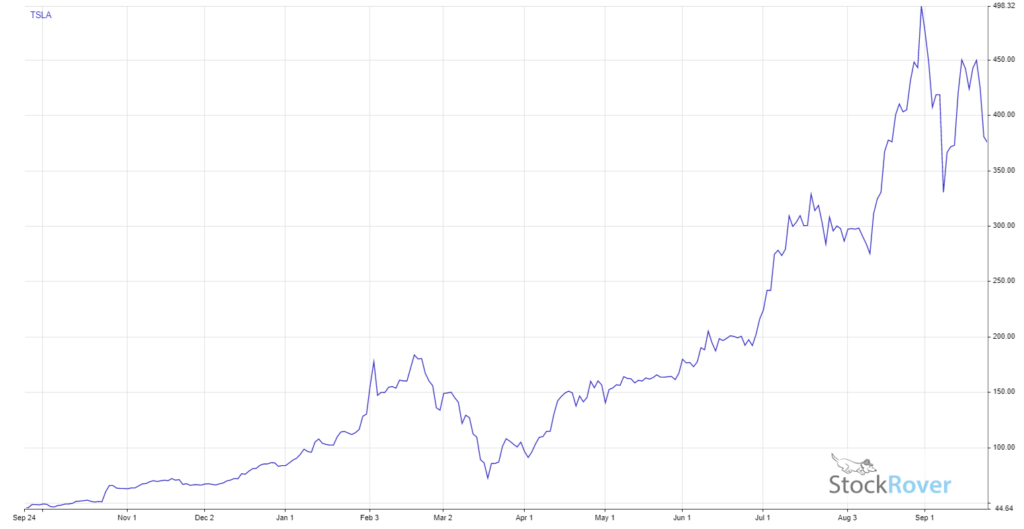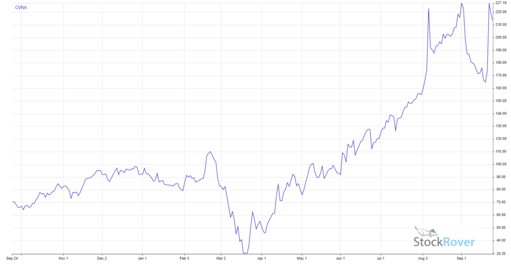 Shares of Carvana Co. (CVNA) exploded 30%, or $53 a share on projections the company will record revenue and profit margins. “Covid-19 is prompting consumers to seek out used cars, and CVNA is a key beneficiary of this trend,” said Alexander Potter, an analyst at Piper Sandler, in a research note, as quoted by Bloomberg. In addition, according to Barron’s, Goldman Sachs’ Daniel Powell says he sees, “a long runway for growth in this category,” and that valuations for Carvana had overcorrected.