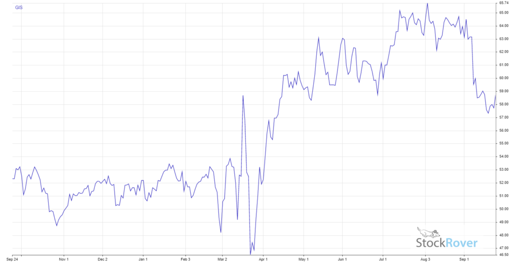 Net income came in a $638.9 million, or $1.03 per share, up from $520.6 million, or 85 cents per share, year over year. Adjusted EPS of 27 cents beat the estimates for 87 cents. Sales of $4.36 billion were up from $4 billion year over year and also beat estimates. General Mills also declared a quarterly dividend of 51 cents on Nov. 2 to shareholders of record as of Oct. 9.